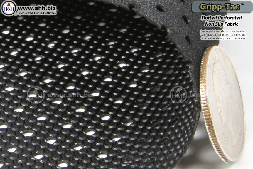 Gripp-Tac&trade Dotted Texture, Perforated is a low stretch, non slip fabric consisting of a woven polyester base with an integral Texturized Rubberized PVC surface that is perforated for ventilation or drainage. This material is highly abrasion resistant, fluid proof, stain resistant, and fire resistant to CAL 117 specifications. Superior grip characteristics wet or dry.
