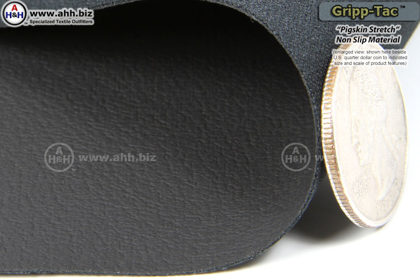 It consists of a 100% polyester knit, stretchable fabric, coated with a textured coating of specially formulated Neoprene rubber. This "Pigskin Stretch" variety features a texture closely resembling pigskin*. This material is thinner and finer than regular Gripp-Tac™ and is specially formulated to be more stretchable along one axis, more flexible, and more lightweight. Use this fabric anywhere you need a water resistant, non-skid, abrasion resistant surface.