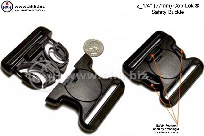 The Cop Lok buckle is a very "beefy" plastic buckle with a safety feature that helps prevent accidental release. This buckle was designed specifically for police and military 2 1/4" nylon duty belts, but it's great for just about any heavy duty utility or tool belt. It features a third release point located in the center of the buckle and an integral curved design that is better suited to be worn on the waist than regular flat side release buckles. Molded from Acetal® High Strength Plastic. Nominal break strength 175lbs. Not for Life Safety devices or restraint devices used in a motor vehicle..