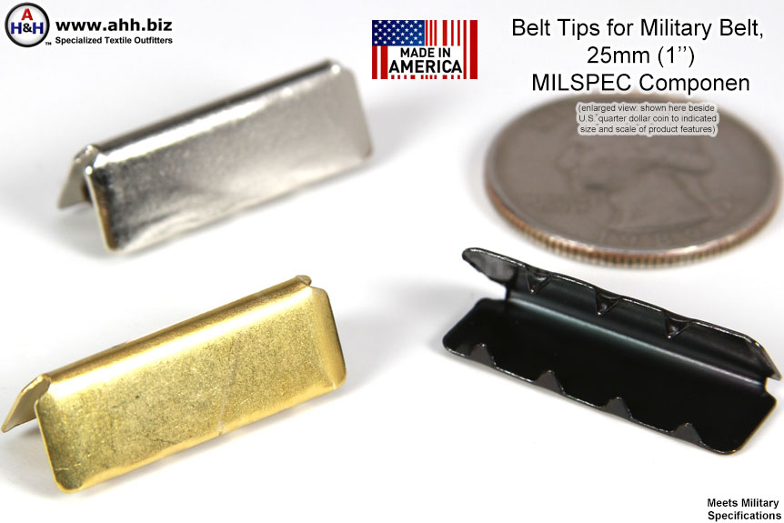 Search Terms / Also Called: Military Belt tips, 1 inch webb belt tips, 25mm belt tips