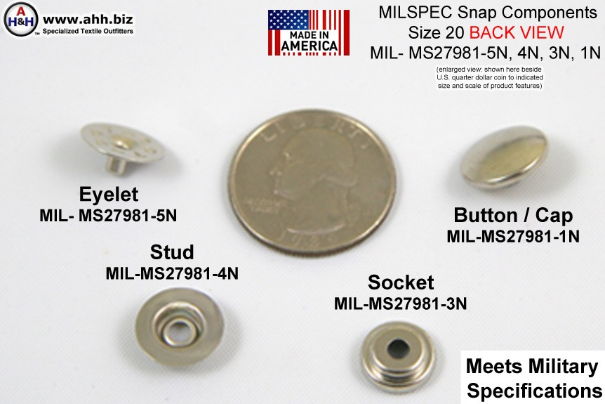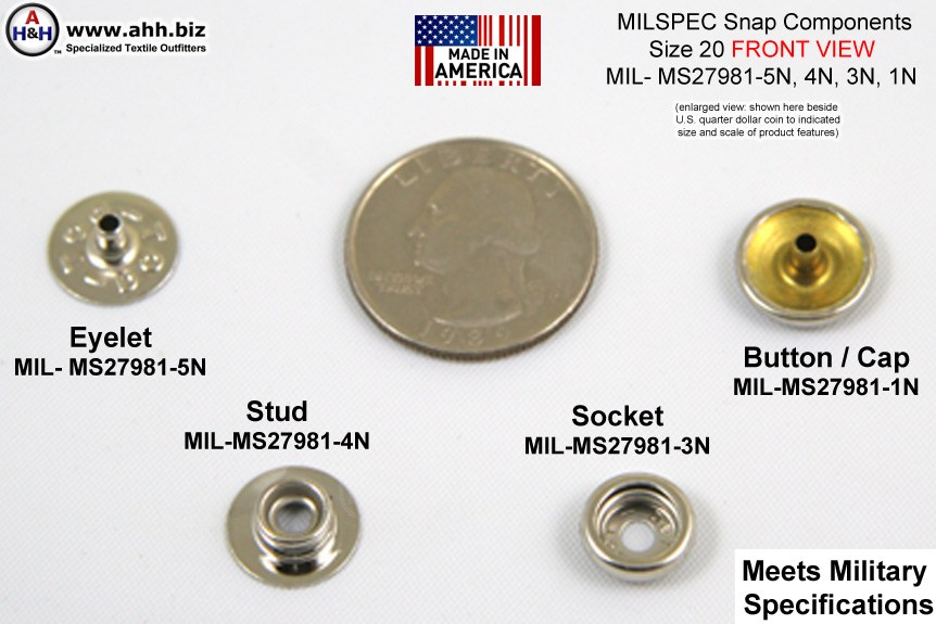 Search Terms / Also Called: mini snaps, baby snaps, snap components, snap buttons, heavy duty snaps, military snaps, MIL- MS27981, snap socket, snap stud, 20 snaps