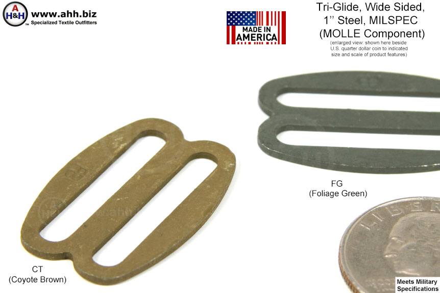 Constructed of Stamped sheet Steel, with Corrosion resistant coating. Tri-Glides are commonly used on webbing belts and carrying straps to adjust the length and neatly manage the slack by doubling it over. Usually used in conjunction with Side Release buckles or Snap-Hooks. Not intended for life safety devices. This variety has wider formed, barrel shaped sides for extra strength compared to regular straight sides. Refer to appropriate manuals for correct field usage. Meets Military Specifications described above. Available in Foliage Green and Coyote Brown