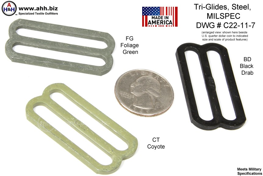 Constructed of Stamped sheet Steel, with Corrosion resistant coating.Tri-Glides are commonly used on webbing belts and carrying straps to adjust the length and neatly manage the slack by doubling it over. Usually used in conjunction with Side Release buckles or Snap-Hooks. Not intended for life safety devices. Refer to appropriate manuals for correct field usage. Meets Military Specifications described above.