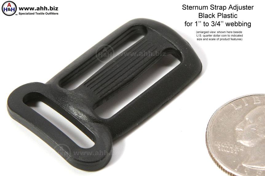 If you are making your own backpack or shoulder rig, you'll need at least one of these Sternum Strap Adjusters. Molded from Delrin® high strength plastic, this is a highly specialized piece of hardware. Essentially a 1" Tri-Glide with a 3/4" loop on one end. Designed to be used (in conjunction with side release buckles) as a means of connecting the shoulder straps on a backpack, across the wearer's chest; for additional stability. Allows vertical adjustment on the shoulder straps and horizontal adjustment on the sternum strap. (the strap that connects the shoulder straps across the chest) Not intended for life safety devices. Also called a backpack strap holder. Overall length 1", width 1 5/8", overall thickness 3/16".