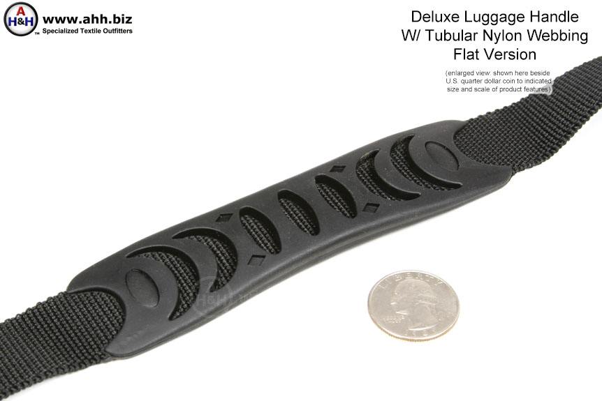 This sturdy but lightweight handle is a composite construction of high strength tubular webbing over heavy rubber tubing, cased with an attractive molded cover of flexible, non-marking rubber. Very comfortable to hold for long periods, even with heavy loads. Same as those found on name brand luggage and backpacks. Overall length (webbing end to end) 16″, grip length 5″, grip width 7/8″ X 7/8″ required mounting space: 6 1/2″. Similar to our regular Deluxe Luggage Handle with tubular webbing ends but with a flat design that is more compact. For applications where size and weight are more critical like airline carry-on bags.