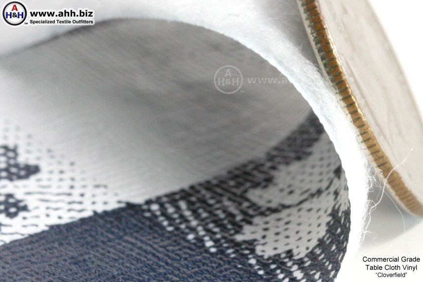 This Premium Restaurant Grade table cloth vinyl is backed with a non-woven polyester flannel and printed with the classic clover field pattern. The flannel backing gives this material a softer, more luxurious feel and allows the material to slip a little bit on the table surface. This slippage allows the material to lay flat and prevents the wrinkles that make coffee cups and wine glasses tip over more easily and generally making your table setting look sloppy. Cheap, non embossed, raw vinyl table cloths without a flannel backing not only feel "tacky", they simply stick like a magnet to smooth table surfaces, especially when the slightest bit of moisture is left on the table after cleaning.